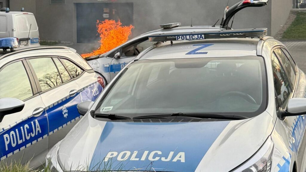 Pojazd służbowy spłonął przed jednostką policji w Warszawie