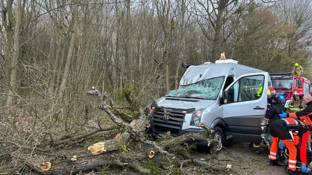Konar drzewa spadł na auto pod Grudziądzem, jedna osoba ranna